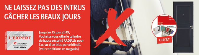 Jusqu’au 15 juin 2019, Alser votre serrurier agréé l'Expert Vachette à Sainte Maxime vous offre le cylindre de haute sécurité RADIALis pour l’achat d’un bloc-porte blindé Vachette.